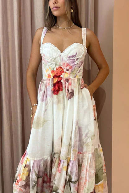 Romantic Date Floral Ruffle Detail Pocketed Corset Maxi Formal / Vacation Dress